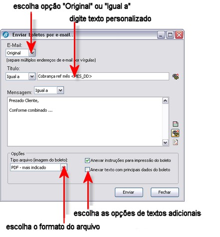 Se for preciso, você poderá anexar no corpo da mensagem as instruções para impressão do boleto e/ou principais dados do boleto (Banco emitente, Vencimento, Valor, Nosso Número, Pagador, Instruções, Linha Digitável e Código de Barras).